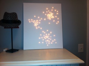 Once I found that image, I searched until I found the tutorial for creating it, which ultimately came from Apartment Therapy. And then, it was off to Hobby Lobby. For less than $15, I picked up a 16 × 20 blank canvas and a package of 100 white Christmas lights (with white light casing and wire too for maximum camouflage). For an extra $10, I picked up a plug-in dimmer to have more control over the brightness of the lights.