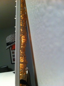 Following the Apartment Therapy tutorial, I started by sketching out some dots with a pencil on the reverse side of the canvas. I loved the three-cluster design of the original image, so I tried to copy that. Once I got in there with the lights though, I realized that sketching out the design ends up being pretty fruitless, since you have to yield placement to however much distance there is between each light. The tutorial suggested poking through the canvas (which is surprisingly tough) with an awl. Since I didn’t have one of those, I used a small screwdriver instead to make the beginnings of the hole. Then it came down to simply jamming the individual light through that hole you started. And then doing it over and over again to create 100 holes filled with 100 lights. The tutorial also recommended securing each light with craft glue, but I didn’t have that and am impatient so I just left it. By criss-crossing the light strand and placing each light at maximum distance from the next one, I was able to make it pretty secure from behind.